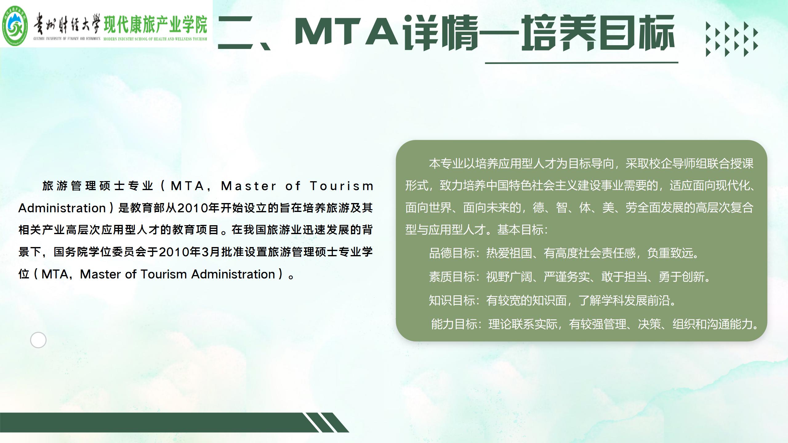 伟德国际victor1946MTA专业于2019年获批设立,依据社会需求和伟德国际victor1946办学优势,设置本专业研究方向涵盖旅游目的地管理、旅游规划与开发管理、民族旅游开发与管理等。