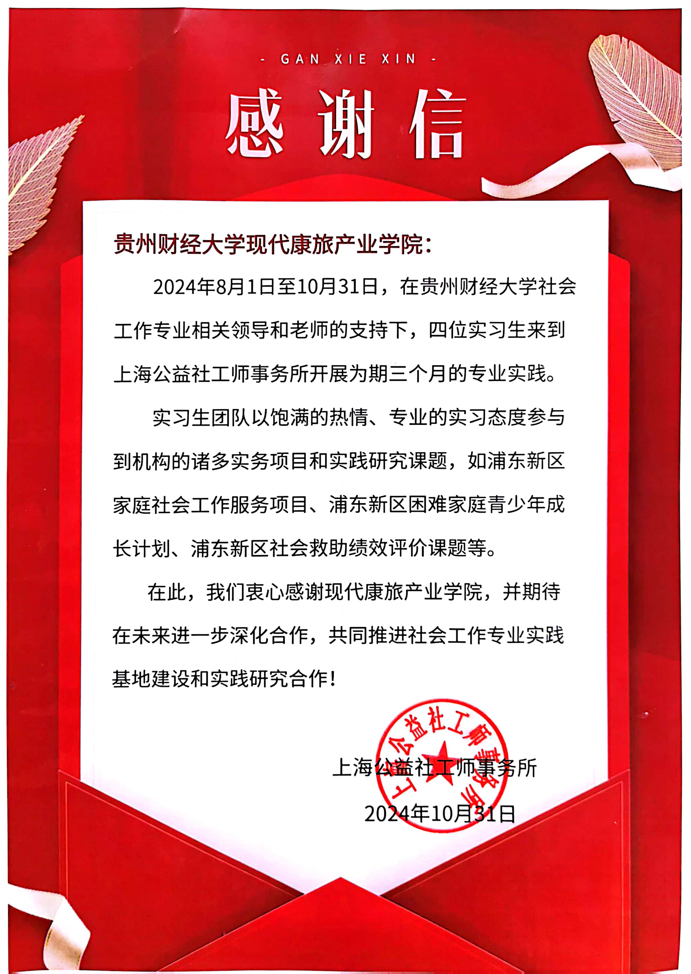 为响应公司号召,进一步将“产学研”工作做好,向发达地区学习先进经验,伟德国际victor1946于2024年8月1日向上海公益社工师事务所派送社会工作专业吴俊杰、李成仟、张成波和李雅翠四位员工进行专业实习。在结束了为期三个月的实习实践后,该机构向伟德国际victor1946发来感谢信,高度赞扬了四位同学的政治素质、专业能力和实践能力。