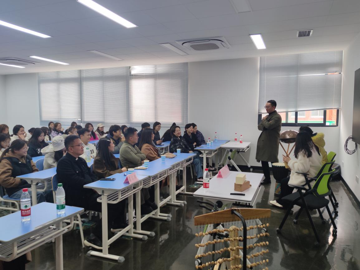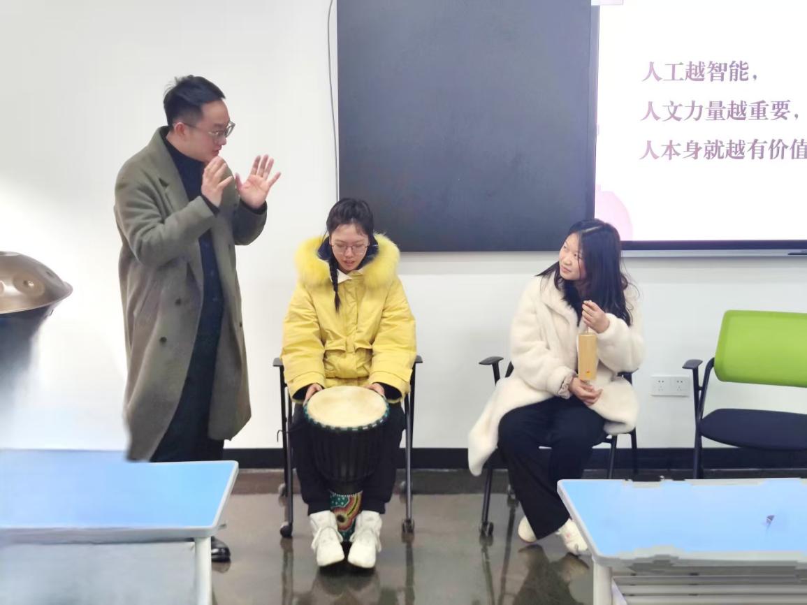 授课过程中,牟青老师十分注重与同学们的互动。现场,他带领同学们一起合奏音乐,大家手持手碟、沙锤等乐器,在美妙的节奏中感受音乐的魅力。当手碟那空灵的声音响起,同学们纷纷沉浸其中,仿佛置身于宁静的世外桃源。在互动过程中,同学们提出了许多关于音乐疗愈的疑问,比如“如何选择适合自己的疗愈音乐”“音乐疗愈对不同年龄段的效果有差异吗”等,牟青老师都一一耐心解答。他表示,选择疗愈音乐要结合个人的情绪状态和喜好,而音乐疗愈对各个年龄段都有积极作用,只是表现形式和侧重点有所不同。音乐疗愈是一种安全、温和的治疗方式,只要在专业指导下进行,几乎没有副作用;而疗程则需根据个人情况和治疗目标而定,短则几周,长则数月甚至更久。