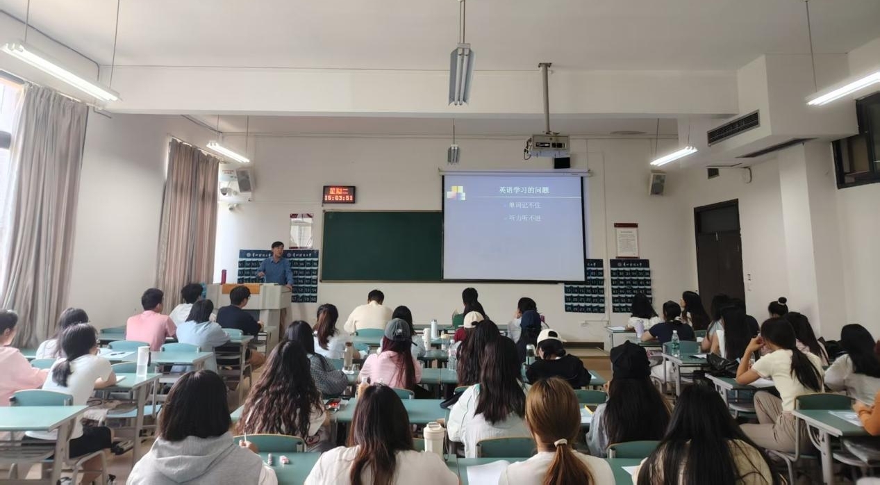 主讲老师向大家展示了英语四级各题型的分值分配,从前缀、后缀、合成、复合、缩略等方面详细地讲解了英语单词的8大构成原理,还为大家讲解了听力、阅读理解、写作、翻译等方面的注意事项以及提分的要点。针对同学们在做题中易出错的地方,并做出强调:要及时进行分析,形成一套完善的解题技巧与方法,要不断反思、不断总结。他幽默独特的讲解方式使同学们受益匪浅。